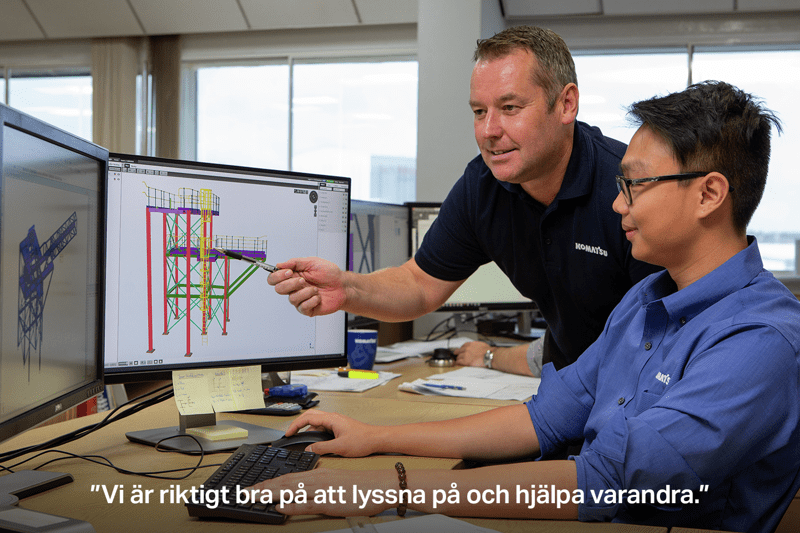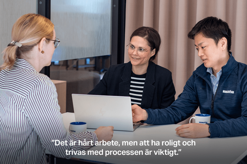 Det är inte bara uppdraget som gör Komatsu speciellt – det är människorna och företagskulturen. Teamet arbetar nära varandra, lyssnar på varandra och delar med sig av sina kunskaper. De samarbetar över funktionerna och stöttar varandra när det blir mycket att göra. Och utanför kontoret har de blivit vänner – de umgås, spelar musik och delar mer än bara en arbetsplats.